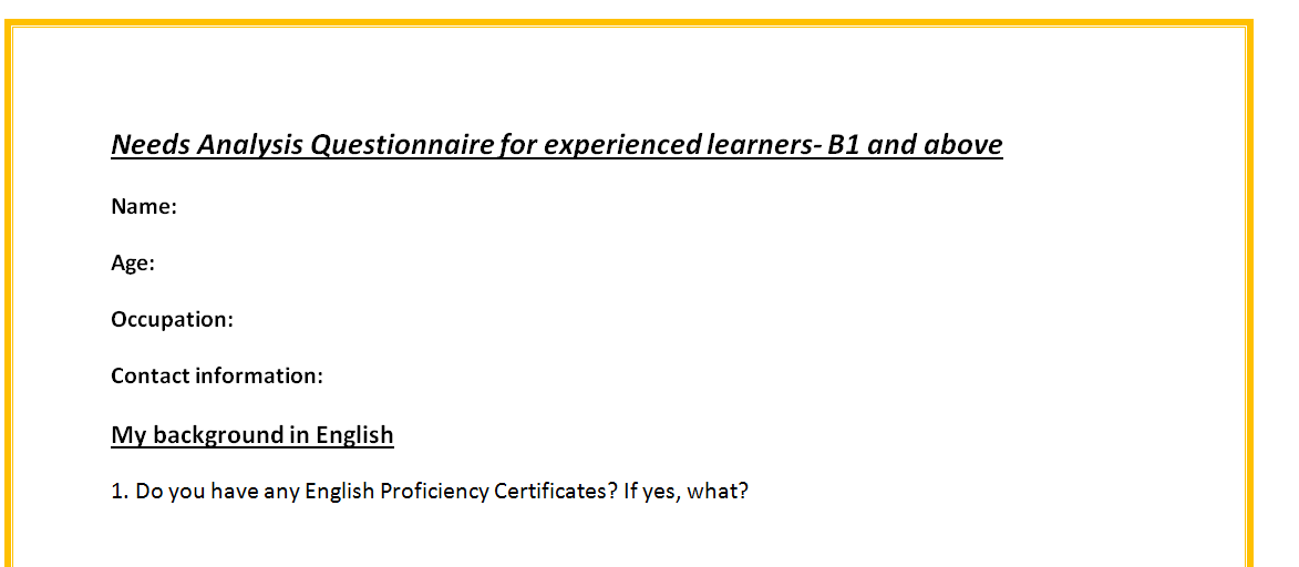 Context: Experienced learners who are B1 level and above (most likely adults who have had English lessons before) . They have probably already had lessons and have contacted you because they want to improve/review their English. This is a very basic questionnaire. I have included a few open-ended questions in order to see the learners’ writing skill as well.