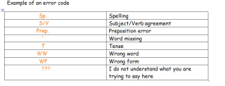 Many teachers use an error code when checking students’ writing. You collect your students’ texts and instead of correcting the mistakes, you use symbols/abbreviations which correspond to language features, you use an error code. So, for example SP. stands for spelling and WW. stands for wrong word. You can make the error code yourself or use something you have found in a book.