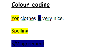 One last thing you need to take into consideration is when to use an error code. Use it on mistakes the learners can correct. If you have a beginners class and you use the error code on, let’s say a verb that should have been in the passive voice, your learner will probably be unable to correct it, so you will only frustrate him/her or make him/her feel bad.